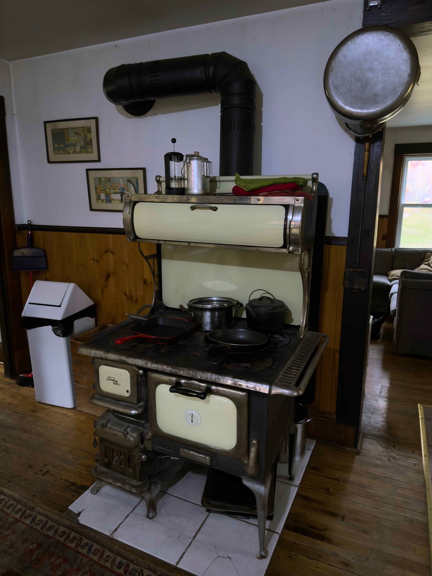 When I work in this region, I stay at an off-grid farmhouse nestled in the Laurentian Hills, near a sacred site known as Oiseau Rock, a place intertwined with the Thunderbird lore of the Algonquin people. The hills rise in waves of granite and pine, their slopes dressed in bright orange oak leaves that catch the evening sun. Springs trickle down through the rock to feed a clear pool that supplies water to the farmhouse and an old log-cabin lodge. The owner, Cam, lives as if time has loosened its grip here. Each winter, he and a few friends cut blocks of ice from the frozen river, storing them in an ice house that keeps food cool through the hottest months. The warmth inside the farmhouse comes from a sturdy Finlay Oval stove in the kitchen and another large woodstove in the living room. When the sun sinks, the absence of screens and electricity lets sleep settle over you naturally, like the forest’s own lullaby.