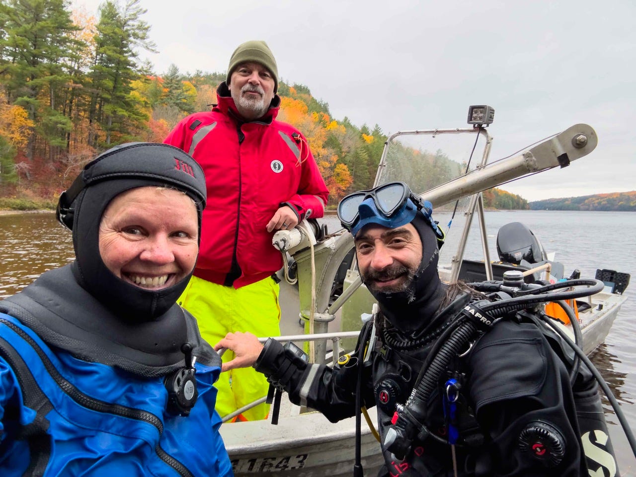 We work long days underwater, pushing our comfort until the cold numbs our fingers and our minds begin to drift with the current. Even here, the mighty Ottawa River can turn wild without warning. One afternoon, as we sheltered in a quiet bay to record our samples, I looked out and saw tall, standing waves marching down the channel, forty-knot winds bending the surface into a rippling sculpture.